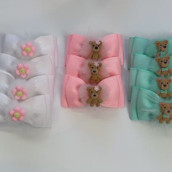 Sweet, soft, and handcrafted with love this adorable baby hair clip features a delicate grosgrain ribbon, fluffy faux fur tulle, and a handmade air dry clay centerpiece. Whether it’s the charming teddy bear or the lovely pastel flower, each bow is a unique accessory perfect for babies and toddlers.