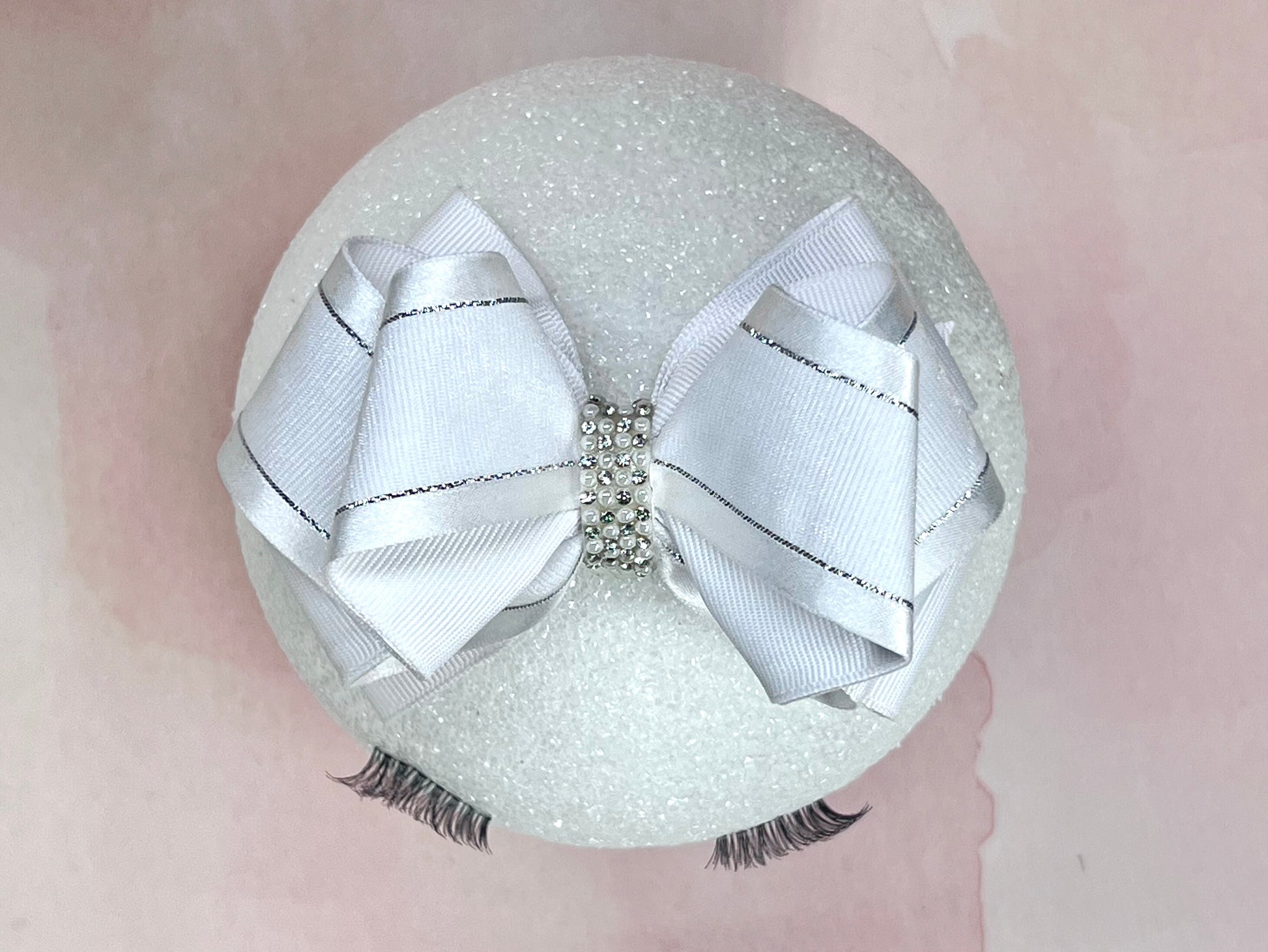 This timeless hair bow is the epitome of elegance, making it the ideal accessory for weddings, baptisms, or other formal occasions. Crafted with layers of soft organza and grosgrain, the double bow design adds volume and sophistication. The centerpiece is adorned with sparkling rhinestones and pearls, creating a refined and luxurious touch. Attached securely to a barrette clip, this bow ensures a comfortable and graceful fit. A versatile accessory that will make any little girl shine like a star on her special day!