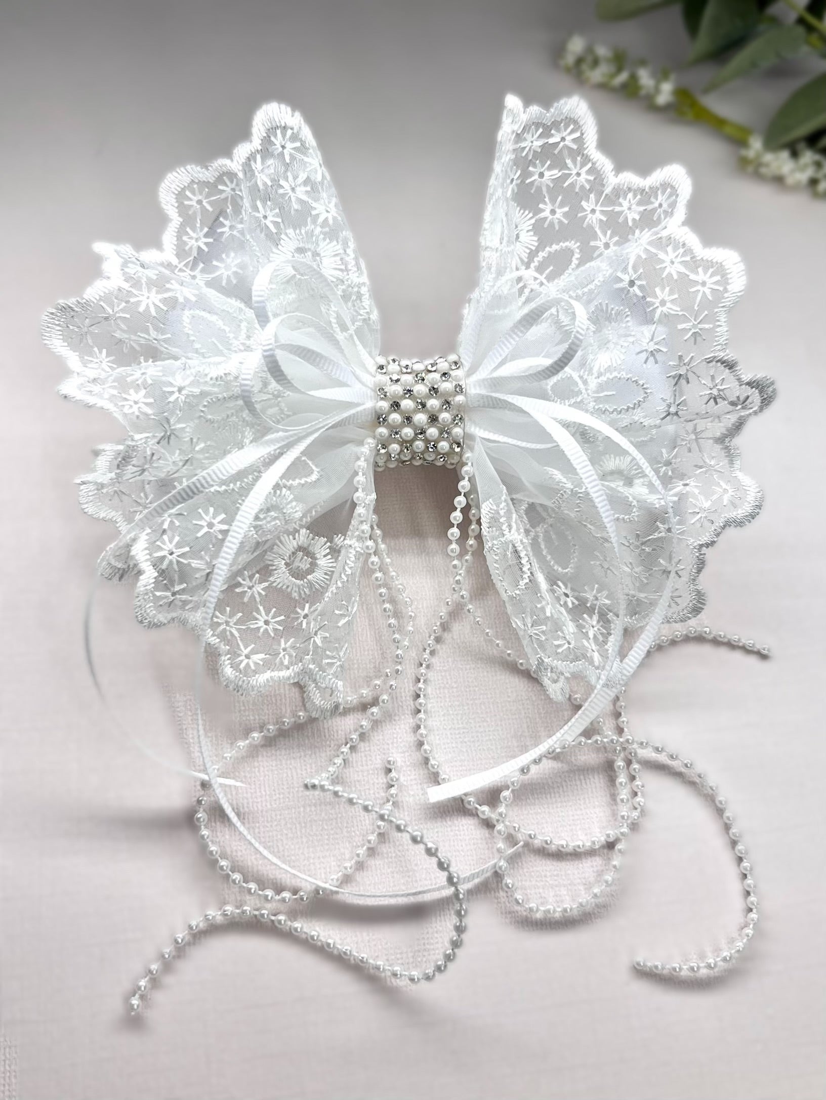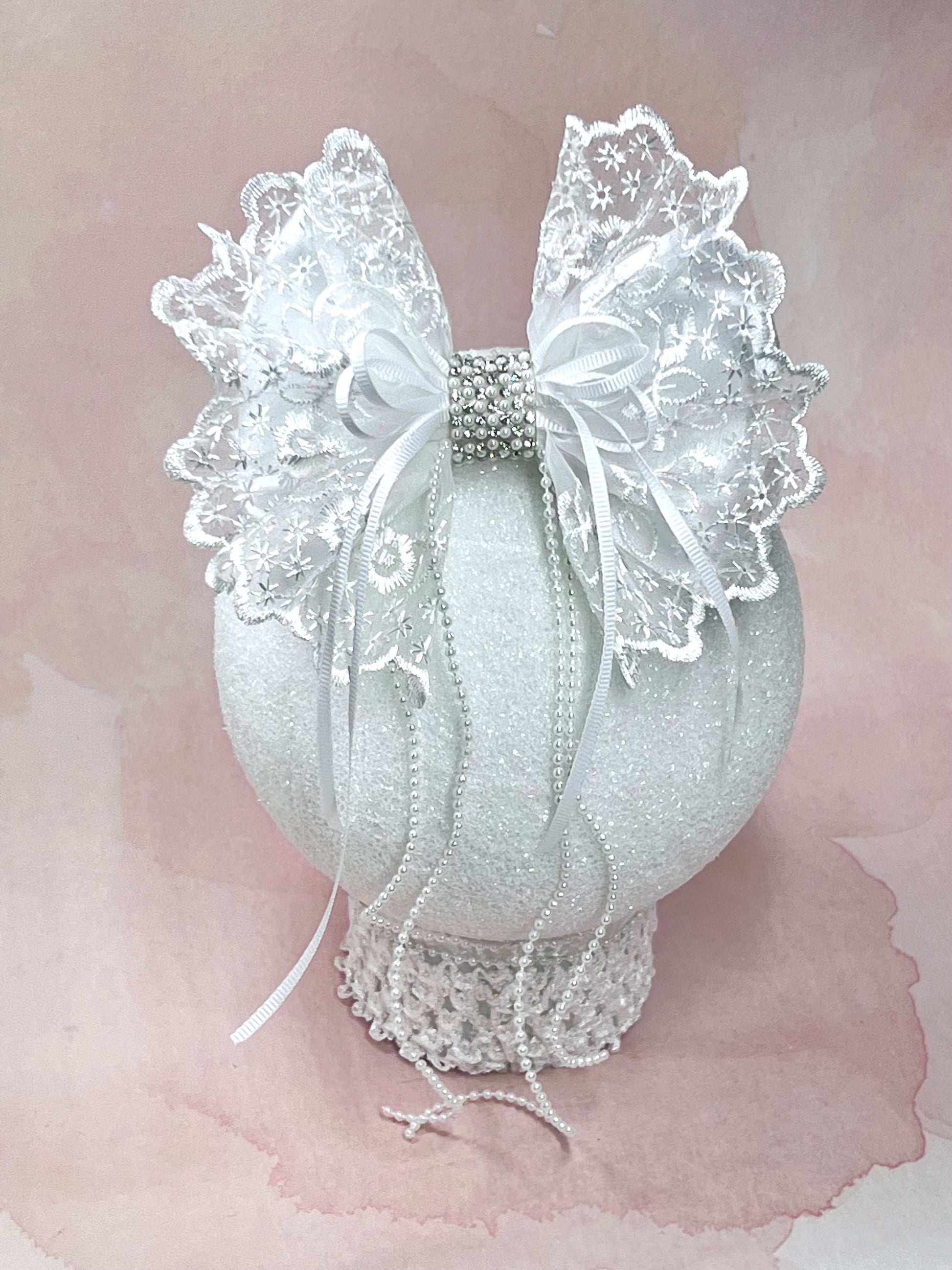 This enchanting white hair bow is a masterpiece of elegance, ideal for weddings, baptisms, or formal events. Crafted with exquisite lace featuring dainty floral embroidery, it creates a soft and angelic look. The bow is accented with sparkling rhinestones at the center, and delicate pearl strands cascade gracefully, adding an extra touch of charm and sophistication. Finished with fine satin ribbons, this barrette clip ensures a secure fit while completing a timeless, graceful ensemble. A must-have accessory for little girls who deserve to shine on special days!