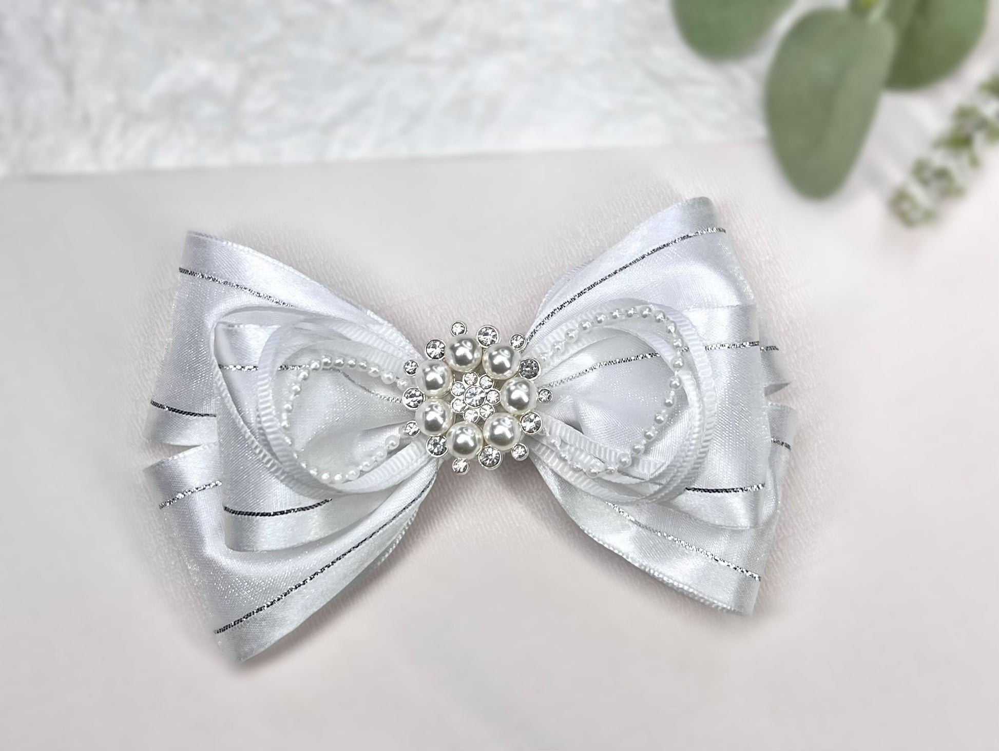 This refined satin and organza hair bow is a perfect accessory for weddings, baptisms, or other special events. The double-layered bow, crafted with shimmering satin ribbons accented with silver trim, exudes elegance and sophistication. At the center, a dazzling cluster of pearls and rhinestones adds a luxurious finishing touch. Lightweight and attached to a secure barrette clip, this piece is both stylish and comfortable for little girls. A timeless design that elevates any outfit for the most memorable occasions!