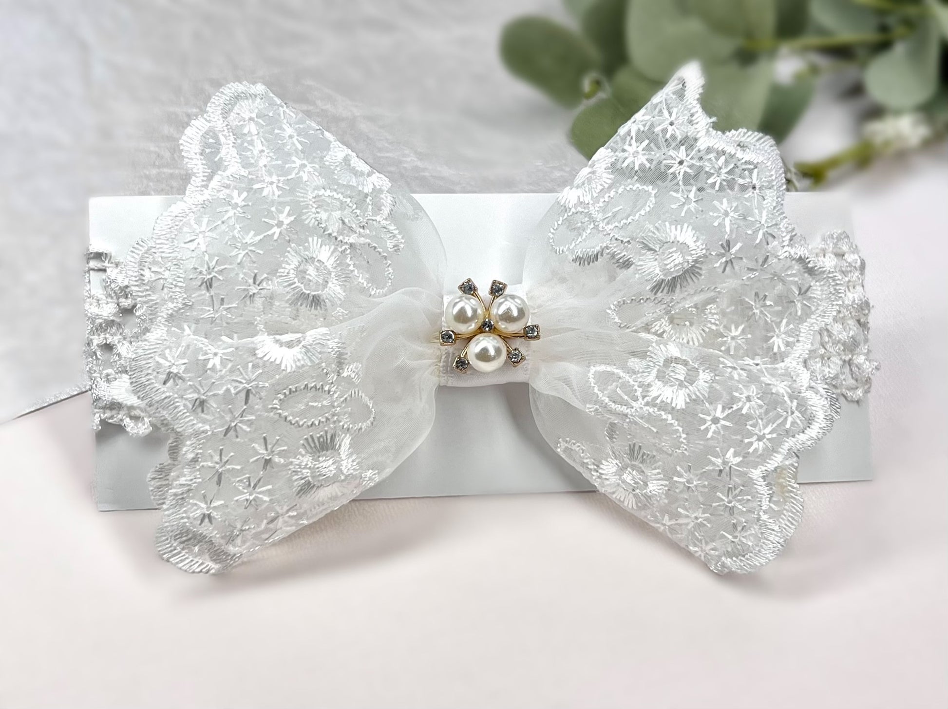 This delicate lace headband is designed for elegance and comfort, making it a perfect accessory for newborns, baby photoshoots, christenings, or weddings. The intricate lace bow showcases beautiful floral embroidery, complemented by a stunning centerpiece adorned with pearls and rhinestones for a touch of sparkle. The stretchy and soft headband ensures a comfortable fit, making it suitable for babies of all sizes. A charming addition to your baby’s special day outfit, this headband is as timeless as it is adorable.